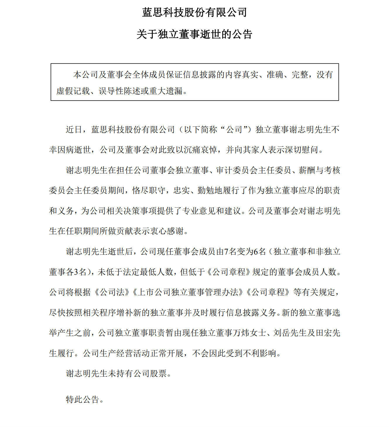 此次谢志明先生逝世后,蓝思科技董事会成员由7名变为6名,其中独立董事和非独立董事各3名,虽未低于《公司法》规定的法定最低人数,但低于《公司章程》设定的董事会成员人数。对此,蓝思科技在公告中表示,将严格按照《上市公司独立董事管理办法》等相关规定,尽快启动新独立董事的增补程序并及时履行信息披露义务,在新独董选举产生前,其原承担的独立董事职责暂由现任独立董事万炜、刘岳及田宏共同履行,目前公司生产经营活动一切正常,此次人事变动不会对日常运营及战略推进产生不利影响。此外,谢志明未持有公司股票。